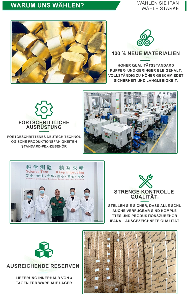 IFAN ist ein chinesischer Hersteller von Kunststoffrohren, -armaturen und -ventilen mit 30 Jahren Erfahrung. Wenn Sie an Kupferarmaturen, Kupferventilen, Kunststoffrohren und -armaturen von IFAN interessiert sind, kontaktieren Sie uns bitte. IFAN bietet Ihnen eine Vielzahl von Standardrohren, um Ihren spezifischen Anforderungen gerecht zu werden. Klicken Sie unten, um mehr über IFANs breites Angebot an erschwinglichen und kosteneffektiven Ventilprodukten und Produkten für Rohrleitungssysteme zu erfahren.